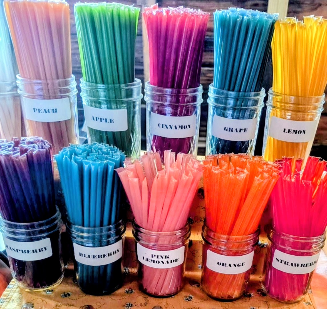 Honey Straws are a favorite of both kids and adults. It is honey (flavored or pure) sealed in a plastic straw. Most people bite them open and suck the honey out, but they are also great for adding to tea, mixed drinks or even cooking.